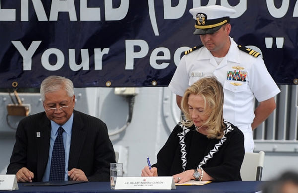 2011年11月16日,希拉里与时任菲外长罗萨里奥在“菲茨杰拉德号”驱逐舰上签署声明,纪念《美菲共同防御条约》签署60周年 图自The Daily Signal