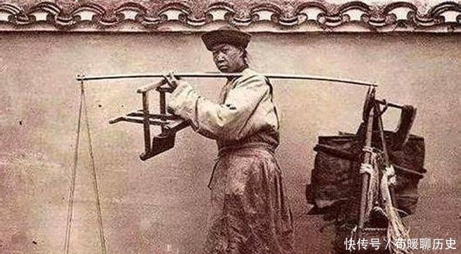 这张照片拍摄的是清朝一位身穿太监打扮的人正在挑选一个担子,不知道里面是存放什么的。不过看这背景应该是在紫禁城的某一处,担子上面还放着许多布料堆在桶上面,并且这位太监还手里拿着一个小板凳。
