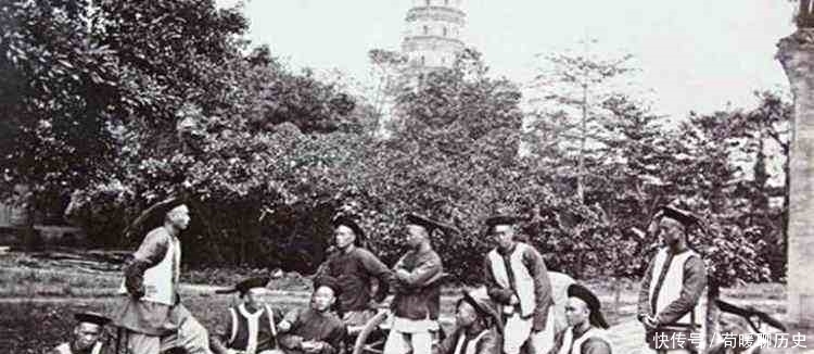 这张照片拍摄的是清朝官兵正在某一处寺庙里休息时的情景,周围的环境看起来非常好。绿树成荫,正好适合夏日纳凉,这些官兵想必是长途跋涉累了便在此稍作休息,看他们还饶有兴致地聊着天儿。