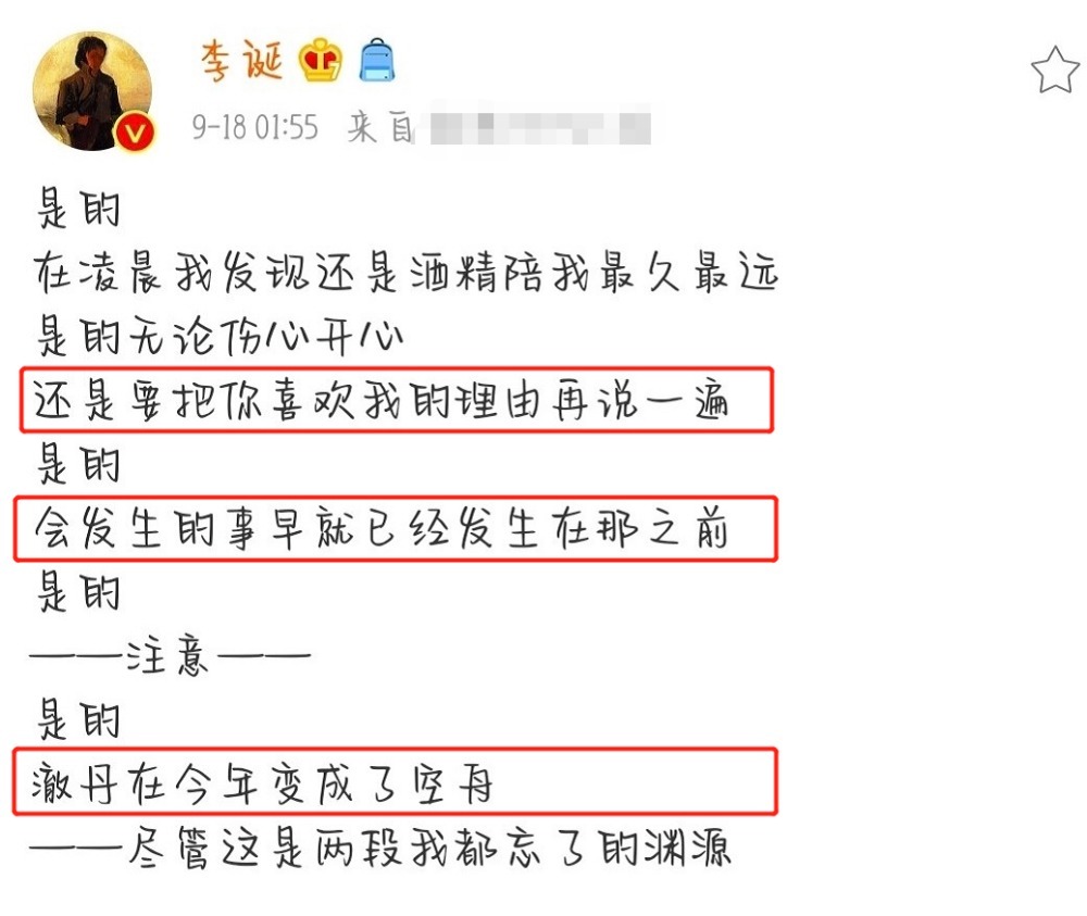 这件事不一定是真的,但李诞在去年的9月份发了一条动态,似乎确实暗示了什么。他在当时发文有些模棱两可,称“还是酒精陪我最久最远”“无论伤心开心,还是要把你喜欢我的理由再说一遍”“会发生的事早就已经发生在那之前”“澈丹在今年变成了空舟”。