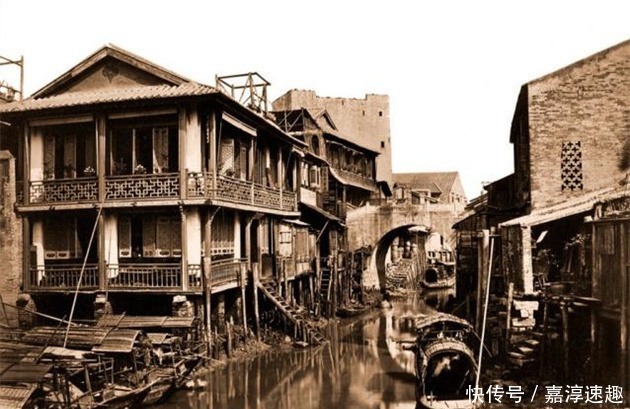 图一:晚清时期沿河而建的楼房照片。这张照片是晚清时期的广州,沿河而建的建筑与河上的船只,乍一看会给人一种江南水乡的感觉。不过如果仔细看,你就会发现整张画面却还是会给人一种衰败之感,冷冷清清的河道之上毫无应该有的生机。
