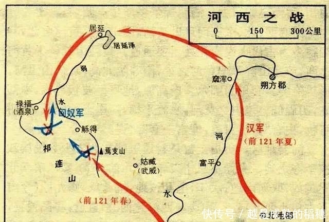 霍去病第一次西征,转战六日千余里,匈奴折兰王、卢侯王被阵斩,浑邪王败走,浑邪王之子及其相国、都尉被俘虏,休屠部祭天的金人被缴获,斩首、俘虏八千余,不过《匈奴列传》则是说"虏万八千余级",数字有些出入,但战功不变、风采不减。可以这么说,霍去病深入敌后、客场作战、以少胜多地将匈奴五王国打残打灭。此次霍去病的西征路线是:陇西郡出发,越乌戾山,渡黄河,涉狐奴水,奔袭越过焉支山,在皋兰山与匈奴主力决战。
