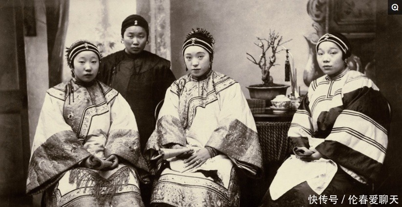 1880年,妇女合影,通过照片可以看到清朝妇女的头上都包着2一块布,这种也是她们服饰中的一种,现在我们在博物馆应该可以看到。