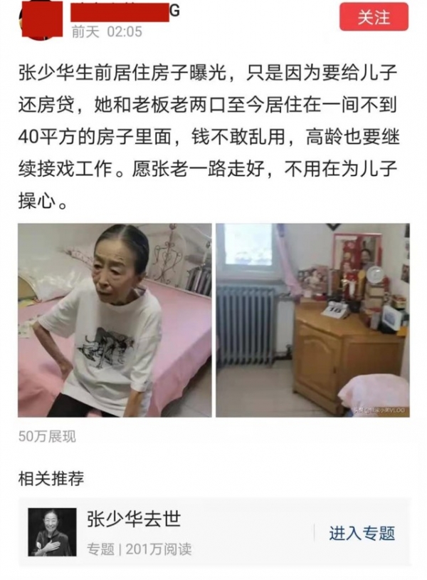 近日,还有网友曝光了张少华生前居住的房子,爆料中称张少华为了给儿子还房贷,钱都不敢乱用,高龄也要继续工作拍戏,至今仍和老伴居住在40平米的房子里。