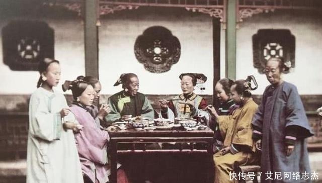这张照片是大户人家的妻妾在一起吃饭的场景,可以看得见,饭桌上的菜式还是很丰盛的。