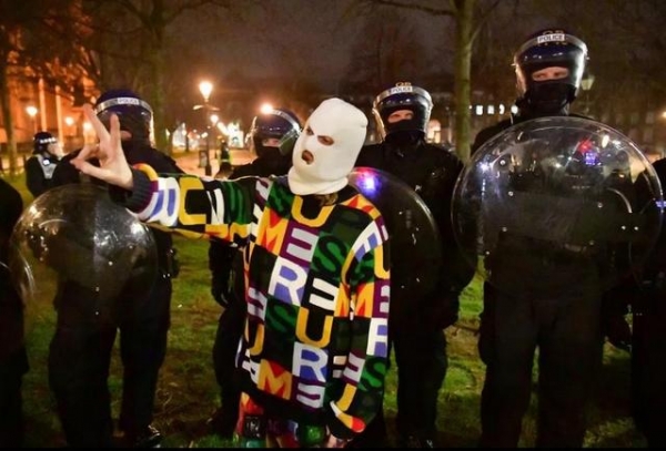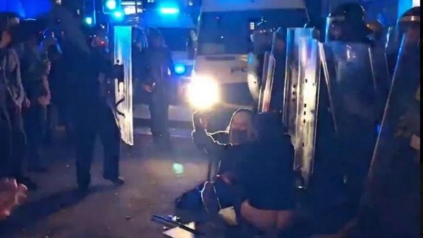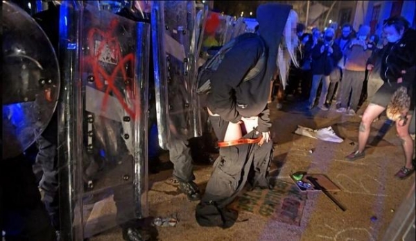 此外,还有一些令人不适的画面曝光出来。一名女抗议者当街小便,而还有两位在警察的鞋上大便,并且自拍留念,警察也是左右为难。