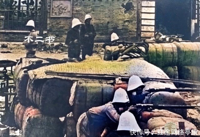 照片拍摄于1900年,在天津街头与清军部队激战的法军部队,法军在街头构建起攻势,旁边的建筑物遭到了战后的摧毁。