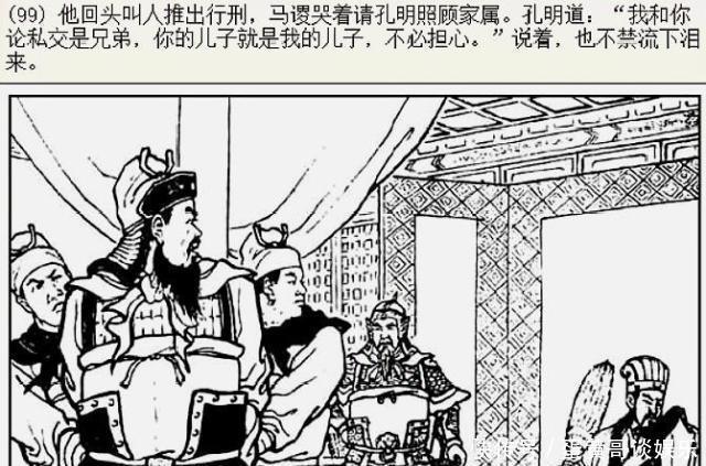 孔明挥泪曰:"吾与汝义同兄弟,汝之子即吾之子也,不必多嘱。"左右推出马谡于辕门之外,将斩。
