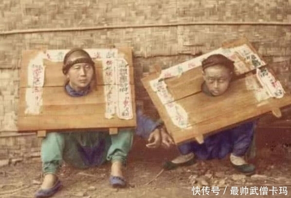 这是晚清时期两名戴枷的囚犯,戴着木枷,表情很茫然