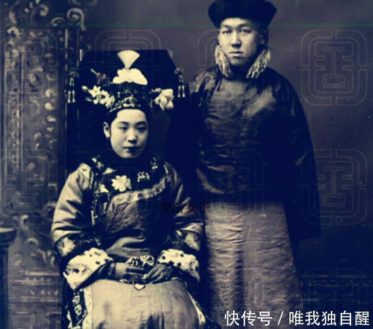 图为晚清某位王孙贵胄的贵妇人,贵妇人穿着锦绣,相貌也十分的端庄美丽,气质娴静的看着远方,十分的淡然雅致。