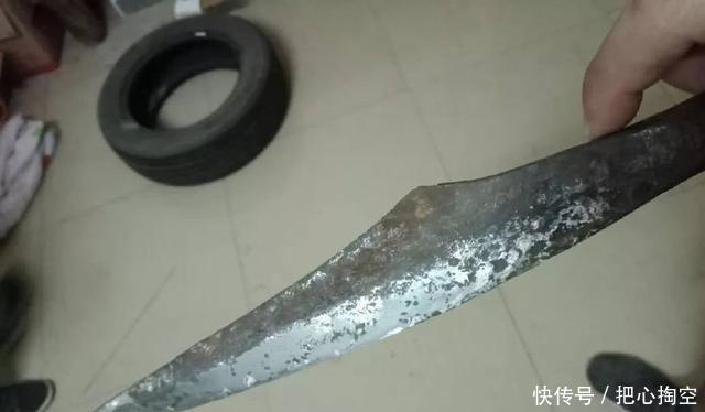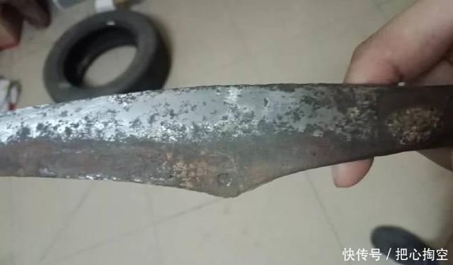 这个矛头在经过初步去壳和粗磨出现了一个有趣的细节。在这把刀的刀背,其实是有孔的这样有孔的刀矛国内圈子里最早有人晒过在南京有出,被认为是六朝的刀矛头。那个孔比这个小,刀也比这款要更弯。孔的用途一般被认为是挂缨,好看。我保留看法,因为这样挂缨有缠住枪头妨碍戳刺的嫌疑。当然有可能打的时候会把缨摘下来,这不一定,我不预设结论,留待各位探讨。三毫米粗的孔这一款的同型器在杭州有出,有鐏,当时拔刀斋有人发帖说收了把"林教头的枪",综合出的地点和形制,因此我认为可以更细致断为南宋的刀矛。