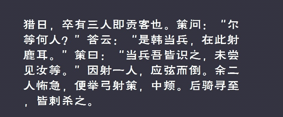 许贡的三个门客,打扮成韩当的部下,在孙策狩猎时将其射伤。孙策面门中箭后,不久身亡,而这三个门客也被孙策部下当场杀死。