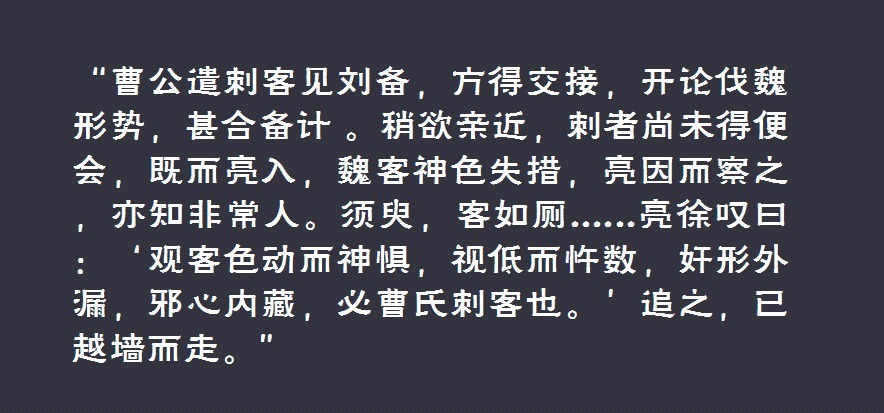 可是,当诸葛亮出现以后,刺客还是因为心虚露而出了马脚,之后便以上厕所为由溜之大吉了。