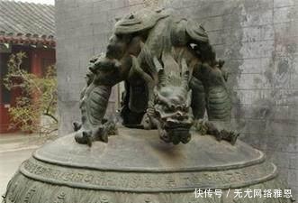 三曰:蒲牢(pǔláo),龙三子,(形似龙而小,性好叫吼,今钟上纽是),喜欢大声吼叫,大钟上边的龙形兽钮就是它的形象。相传蒲牢住在海边,特别害怕鲸鱼,每当遇到这种庞然大物,它就会被吓得大声吼叫,所以人们把它铸在钟上,以发出洪亮的钟声。