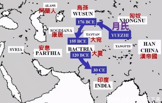 欧亚大草原印欧人的尾声,可能不在阿兰人被匈奴逐入西班牙,而是发生在历来被忽略的大草原的中段。这一章必需由"月氏人"在汉初被匈奴何驱赶到中亚说起。现在回到早一点的时候,公元前,东南边是汉帝国、东北边是匈奴,月氏人本来是在中国的甘肃省,他也像后来匈奴被赶一样先经过伊犁河谷,然后南下经过大宛,灭掉一个希腊化的王国,就是亚历山大当政以后,他的继业者在中亚建立一个希腊化的国家,统治了希腊,叫Bactria,就是大夏。然后进入印度。安息就是第二波斯帝国。