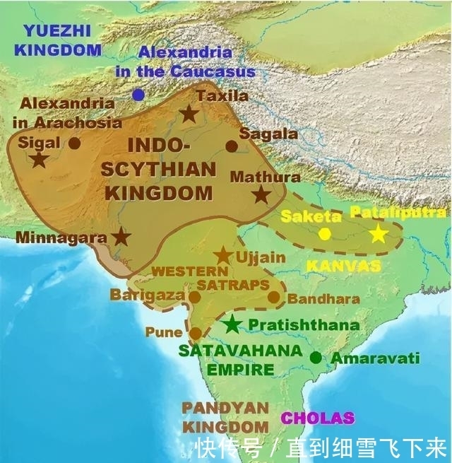 公元前100年前,被大月氏人驱逐的塞人(Sakas),中国史书里面的塞王,原来的地盘被匈奴夺走,在大夏稍作停留后,就进入今日的西阿富汗、巴基斯坦西南、东伊朗之地,给该地留下赛斯坦(Sakastan)之名,成为塞人进入印度的前进基地--等于大月氏被匈奴赶跑,这也是一个雪崩效应,跟罗马帝国的民族大迁徙其实差不多。塞人先于贵霜经印度西北边境这个缺口进入印度,他们侵占了在北印度的的大夏王国之地,等于他们先进入大夏国,贵霜进入之后才把他们赶走。进入印度以后,彻底灭了印度希腊政权,史称"印度塞人(Indo-Scythians)。