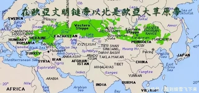 而要讲匈奴时代,无论如何都必须要从欧亚大草原来谈起。欧亚文明链带以北是欧亚大草原,从东到西,东边是松花江,呼伦贝尔草原,西边是喀尔巴阡盆地、匈牙利,两头都是尖的,好像一个大网,中间吞了两头大象,一个是蒙古草原,一个是今天所谓的哈萨克草原。