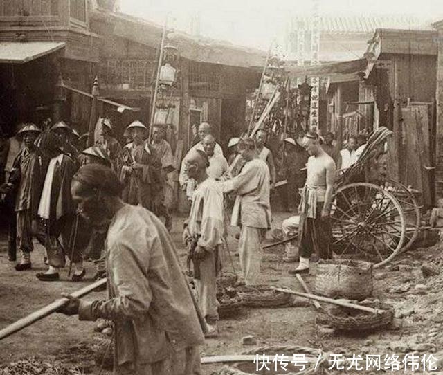 1905年,晚清天津一角的商贩们,他们的穿着以及所携带的物件,可见生活的不易,路上有衙役路过,他们的神气自若与商贩们的忙碌,形成了鲜明的对比,实属罕见。