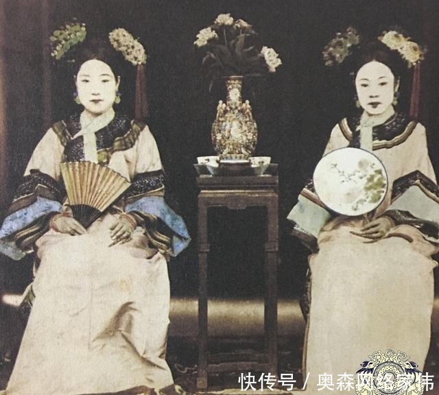 清末醇亲王的两个侧福晋,手持圆扇的是刘佳氏,也就是末代摄政王载沣的生母,她为醇亲王生了载沣、载洵、载涛三个儿子,很受其宠爱。