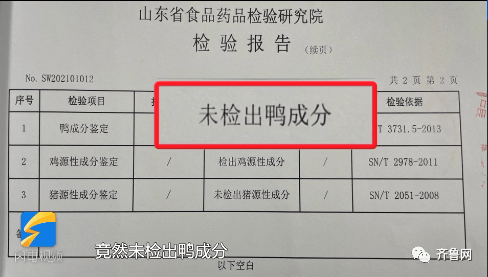 做外围调查的同事在小龙坎伟东店现场购买了一份鲜鸭血后,送往山东省食品药品检验研究院进行检测。拿到的权威检测报告显示:小龙坎伟东店里售卖的鲜鸭血竟然未检出鸭成分!