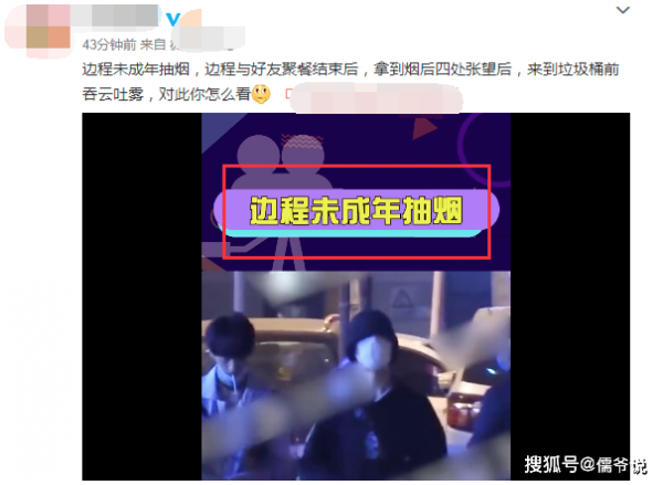 当天,边程与好友聚餐的画面,一行人聚餐结束后走出餐厅,其中一位好友拿出烟盒给大家分发,边程拿到烟后四处张望,随后来到垃圾桶前吞云吐雾起来。