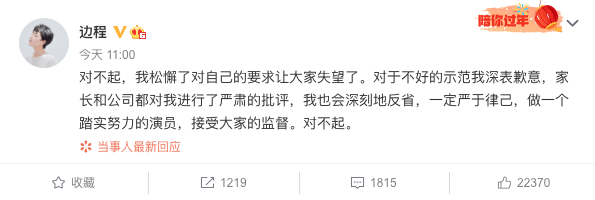 在看到自己抽烟上热搜后,边程很快便发声道歉:对不起,我松懈了对自己的要求让大家失望了。家长和公司都对我进行了严肃的批评,我也会深刻地反省,一定严于律己。并表示以后会接受大家的监督,做个踏实努力的演员。