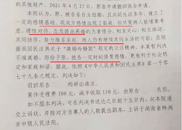 4月27日,醴陵市法院对二人的离婚案进行了一审判决,法院认为两人系自愿结婚,而且在一起生活多年,有一定的感情基础。虽然现在双方的感情出现了裂痕,但只要两人能慎重考虑,理性对待,仍然有共同生活的可能,最终法院驳回了王涛的离婚申请。