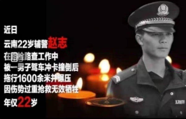 5月18日,据人民网报道,2021年5月11日,云南省曲靖市师宗县公安局大同派出所的辅警赵志,在开展路检路查工作的时候被一个男子驾车冲卡撞倒,后又被肇事车辆拖行了1600余米并碾压,随后同事将其送往医院抢救,最终因伤势过重抢救无效牺牲。