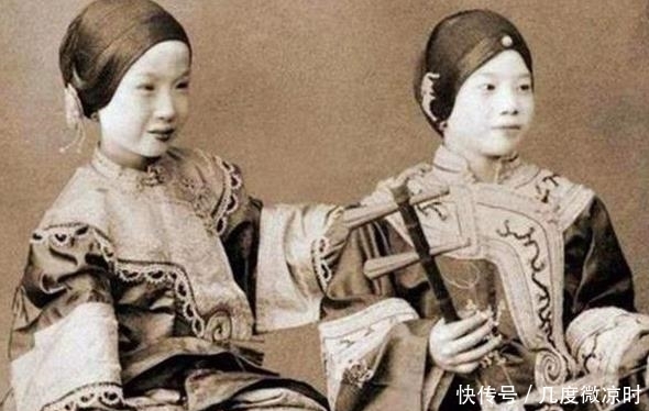 图中是清朝的两名宫女,一个宫女官职更高,带有旗头,但是颜色比较素淡,身旁这位宫女则只是编织一个简单的辫子,刘海也是参差不齐。但是她们都穿着花盆底鞋。
