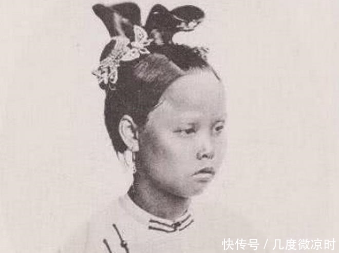 这是清朝百姓平常家女子的发型,简单的将发髻挽起来,但是可以看得出发量是非常的多。不像电视剧里的小姑娘又是半扎着又是编着小发辫。