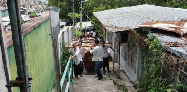 赌王棺木由楠木所造,价值800万港元重达几百斤,八个仵工为主力,还有多名仵工协助,即便如此仍有些吃力,中途不得不停下脚休息。