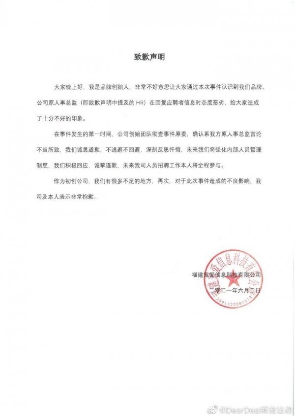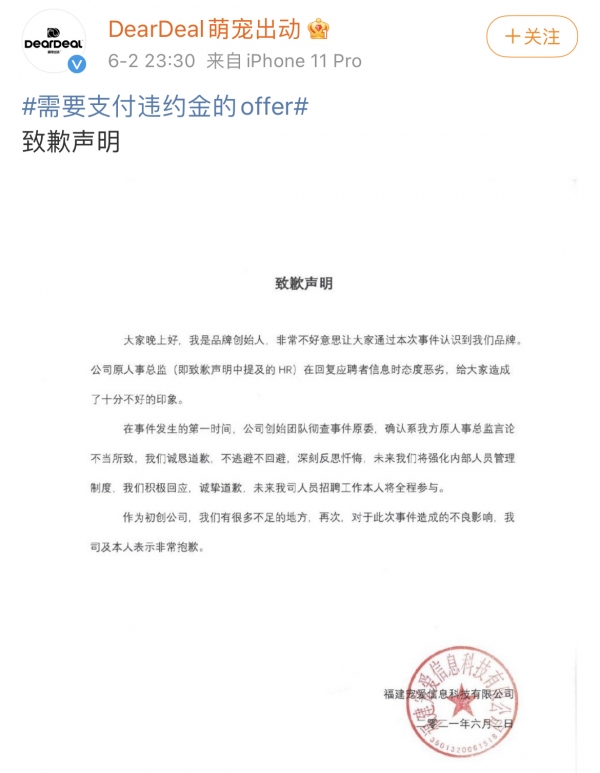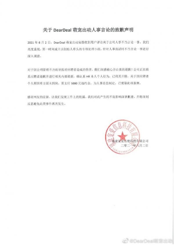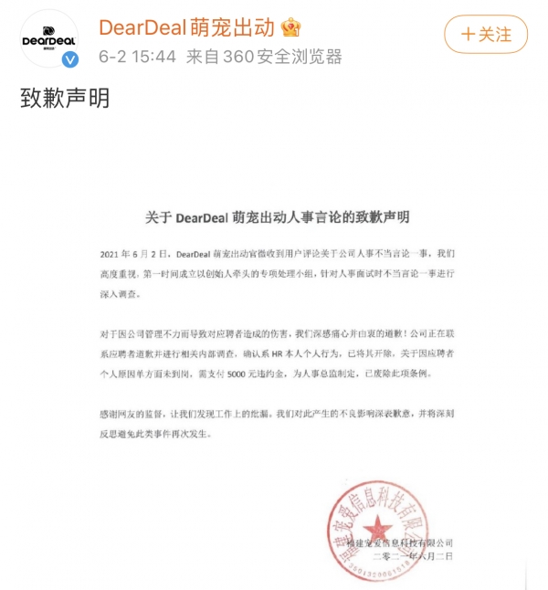 6月2日,@DearDeal萌宠出动 两度发文致歉,承认涉不当言论的人事系该公司人事总监,公司已将其开除;关于因应聘者个人原因单方面未到岗需支付5000元违约金的条例由该人事总监制定,已被废除;公司正在联系发文爆料的应聘者道歉并进行相关内部调查。