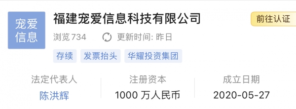 根据启信宝信息,@DearDeal萌宠出动 的公司为福建宠爱信息科技有限公司,注册资本1000万人民币,法定代表人为陈洪辉,2020年5月27日成立。