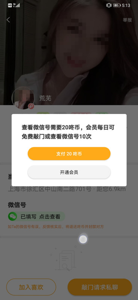 软件的用户很容易就可以找到同住一家酒店或者附近酒店且独自居住的房客,而若要进行私聊、私密评论或发布个人动态等,则需要充值购买“咚币”或充值成为“VIP会员”。软件中留言墙、聊天室、话题广场等功能区的留言大多显示为女性用户发布,内容暧昧露骨,图片文字极具诱惑、充满暗示。