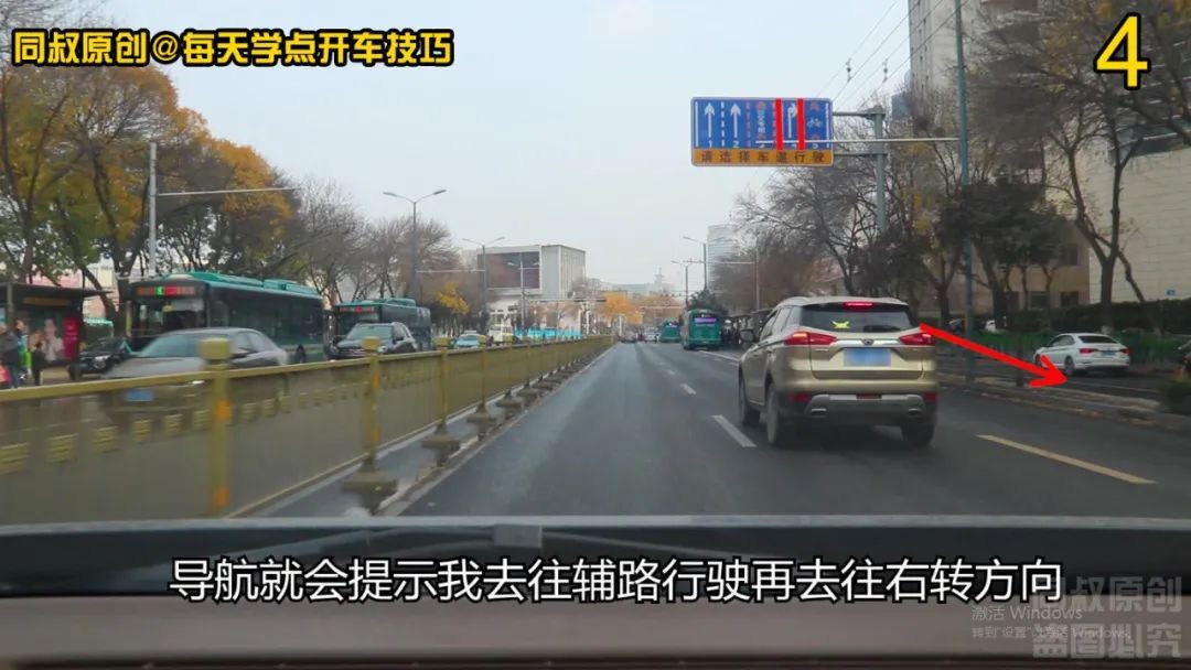 我要去往的目的地在直行方向的话,导航此时会提示我靠左边两车道行驶,这就是指的左侧两个车道都可以去往直行方向,假如我去往的目的地在右转方向,导航就会提示我去往辅路行驶再去往右转方向。