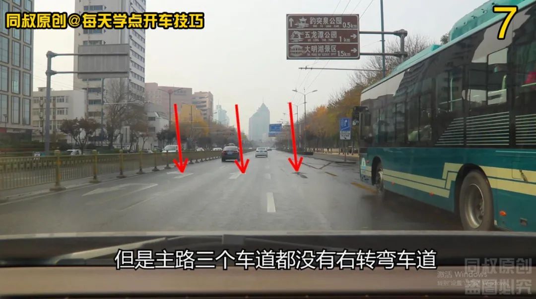 还有一种情况,就是前方路口打算右转弯,但是主路三个车道都没有右转弯车道,这个时候导航会提前提示你,注意进入辅路行驶,在辅路到达路口右转弯。