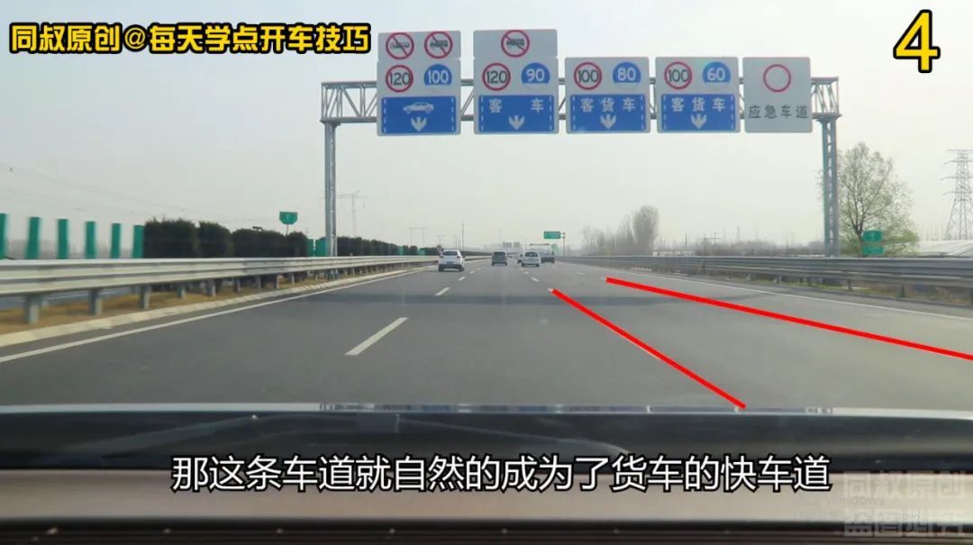 对应到第三车道的标牌上,写了客货车三个字,意思是大小型客车和大小型货车都可以在这个车道行驶,本车道限速80到100公里,由于第一和第二车道禁止货车驶入,那这条车道就自然的成为了货车的快车道。