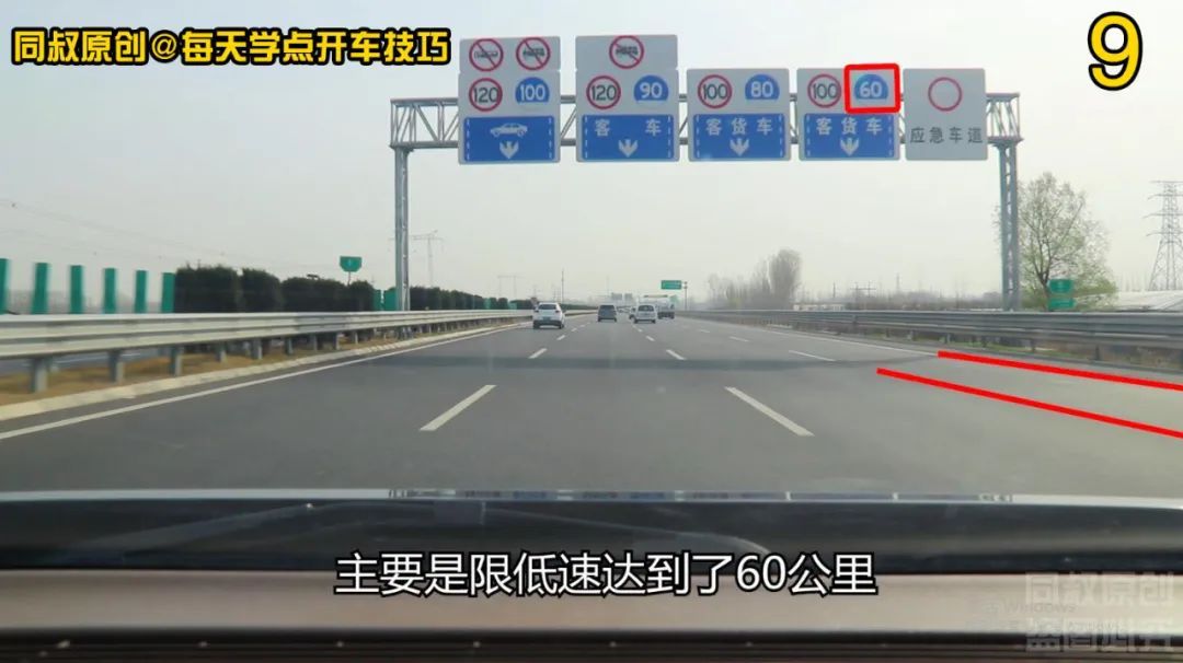 对应到第四车道的标牌上同样是写了客货车三个字,但是限速标准有所变化,主要是限低速达到了60公里,这个60公里是高速公路的最低时速标准,以低于60公里的时速在高速公路上行驶属于违规行为。第四车道是本条高速的最慢车道,那些重载的跑不快的大型车辆,都会走这一条车道,这样就客观上造成了这条车道的慢速。