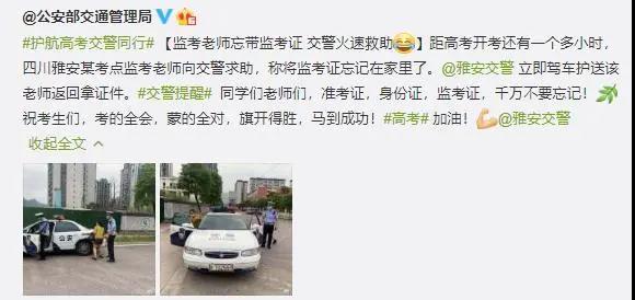 2020年,四川雅安。距高考开考还有一个多小时,某考点监考老师向交警求助,称将监考证忘记在家里了。雅安交警立即驾车护送该老师返回拿证件。