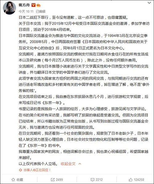 面对争议,蒋方舟7号在微博通过图片回应称“此次(赴日)交流为公开正常的文化交流,特此声明”。
