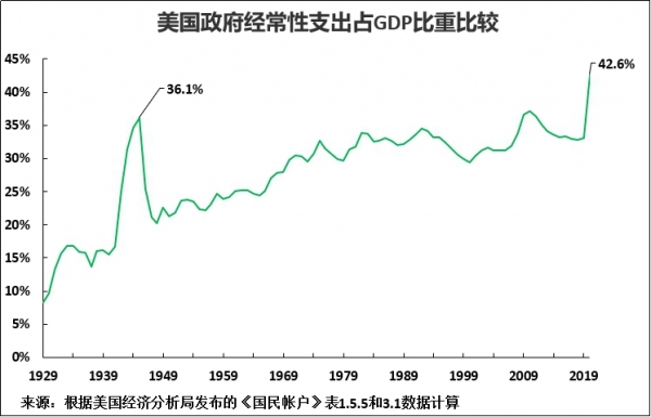 图3所示的是美国政府经常性支出占GDP比重——不包括投资,或许它反映的趋势更为引人注目:美国政府经常性支出占GDP比重甚至高于战时。二战期间美国政府经常性支出占GDP比重的峰值为36.1%。但2020年美国政府经常性支出占GDP比重为42.6%,甚至大大高于二战时期水平。