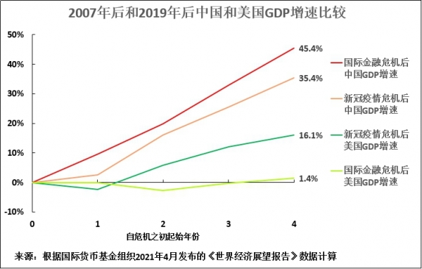 从这些经济事实得出的总体结论是,由于庞大的刺激措施,美国新冠疫情后的经济表现将好于国际金融危机后的经济表现——而中国的表现将不会像当年那么好,因为缺乏类似的大规模刺激措施。这一点在图9所示的国际货币基金组织(IMF)对中国和美国经济的预测中得到了清楚的体现。IMF预测,由于美国经济刺激计划的规模很大,与国际金融危机后相比,此次疫情危机后美国经济表现得更好。在国际金融危机爆发后的四年中,美国经济仅增长了1.4%,而在新冠疫情之后的四年中,由于其巨大的刺激措施,美国经济预计将增长16.1%。相比之下,在国际金融危机后的四年中,中国经济增长了45.4%,而在新冠疫情危机后的四年中,中国经济预计将仅增长35.4%。