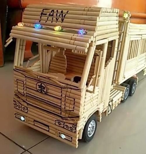这名男子平日就不赞成用一次性筷子,觉得是浪费资源。一次突发奇想,对废弃得筷子进行再利用,做成卡车工艺品。
