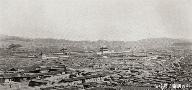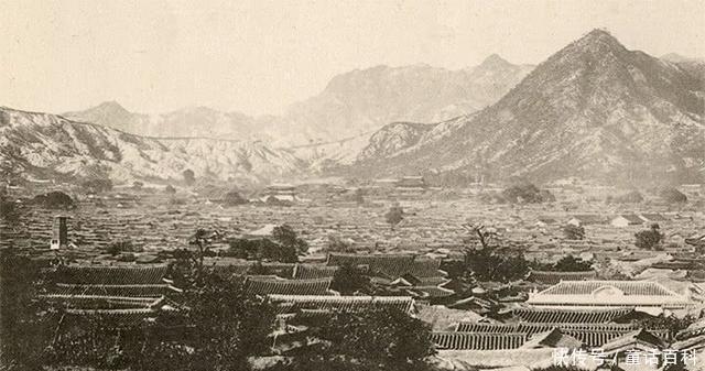 1897年李朝高宗建立大韩帝国,并称帝,汉城称为帝都,图为1897年汉城城市景观,远处是李朝的王宫景福宫。