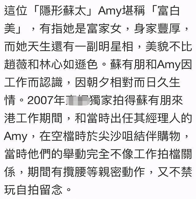 不过苏有朋和经纪人私下关系确实很好,且两人经常一起出门游玩购物。2007年的时候还被港媒拍到过两人一起逛街,期间苏有朋揽着Amy,看起来十分亲近。