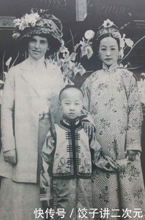 清朝时期西方的照相技术开始流传到东方,一开始是不少达官显贵喜欢拍照,借此炫耀自己的身份地位,尤其喜欢拉着外国洋人合照,凸显自己的身份。图中的满洲贵妇拉着儿子一起和外国女人照相,照片里的儿子还年幼,拉着母亲不肯撒手。