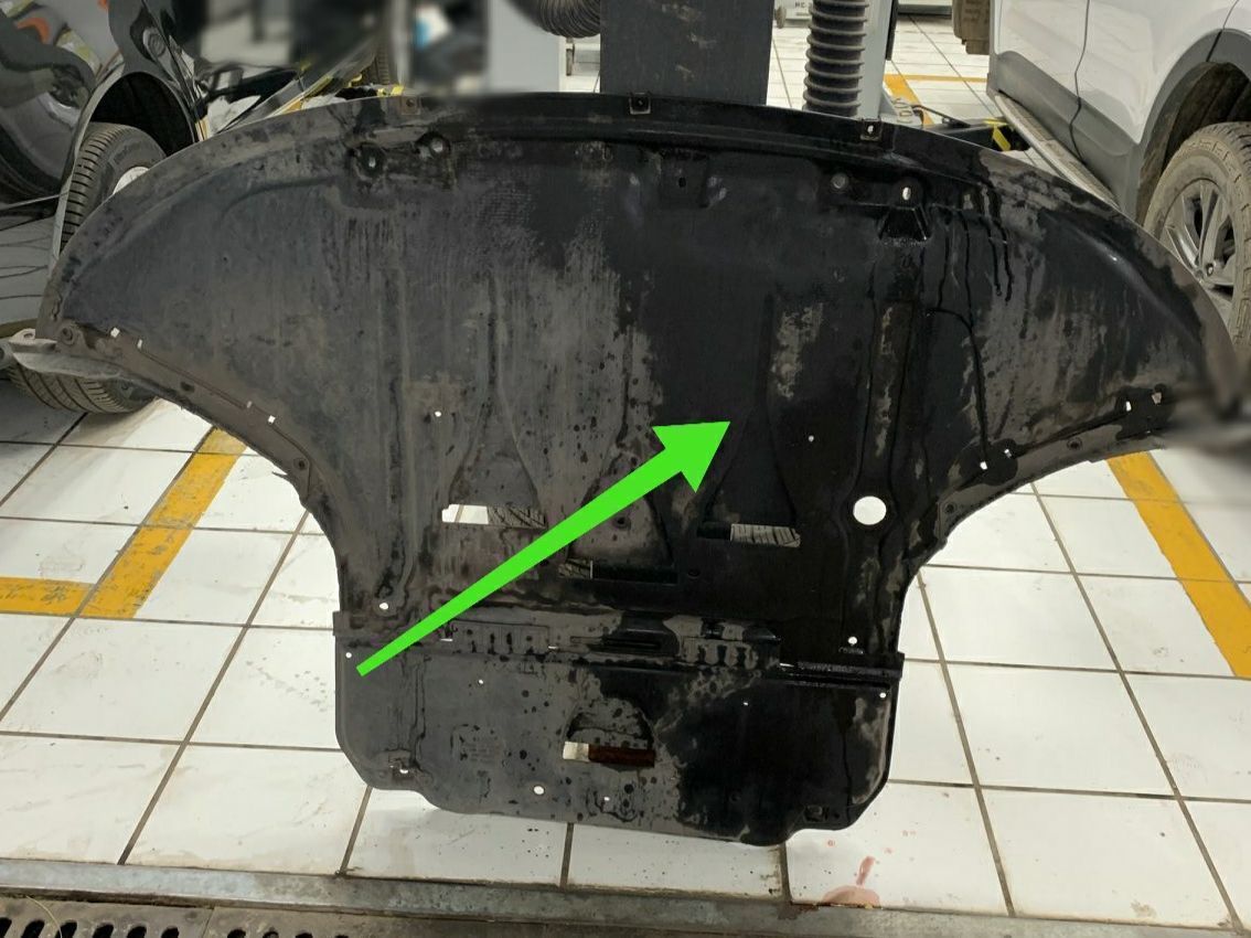 下图所示,这辆奥迪的下护板,上面的液体都是冷却液,如果这些液体是机油的话,将会吸附有很多的灰尘。