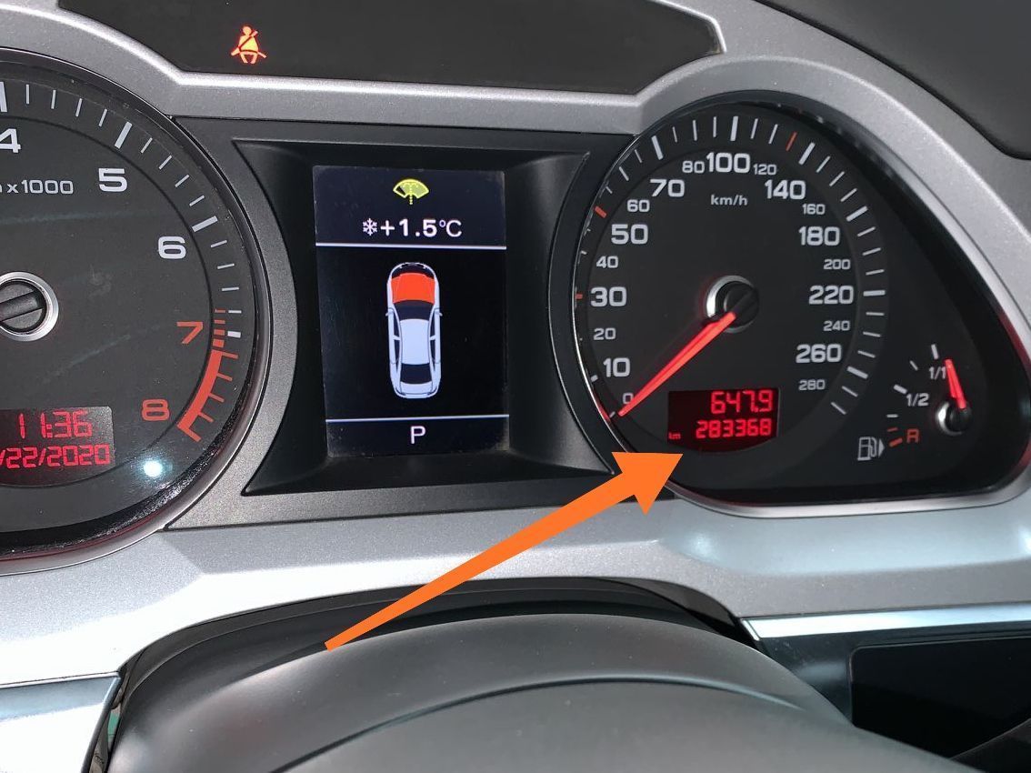 难道车主不知道发动机渗漏冷却液吗?询问车主得知,车主知道车存在慢渗冷却液的问题,车上准备的有冷却液,每隔半月左右就会添加冷却液,想着拖一拖再维修。下图所示,这辆奥迪的仪表,行驶里程已经超过28万公里。