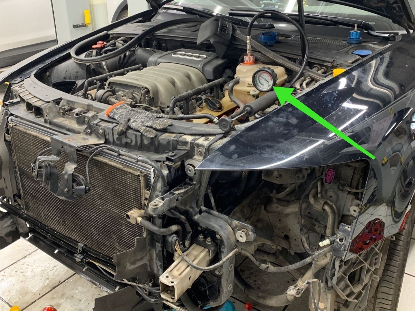 十分钟后,检查打气泵的压力表基本没有变化,说明冷却系统密封良好,然后师傅拔下打气筒,连接如下图绿色箭头所示的设备,在设备上又连接高压气管,给冷却系统抽真空,可以看到黄色箭头所示的橡胶水管变扁了。