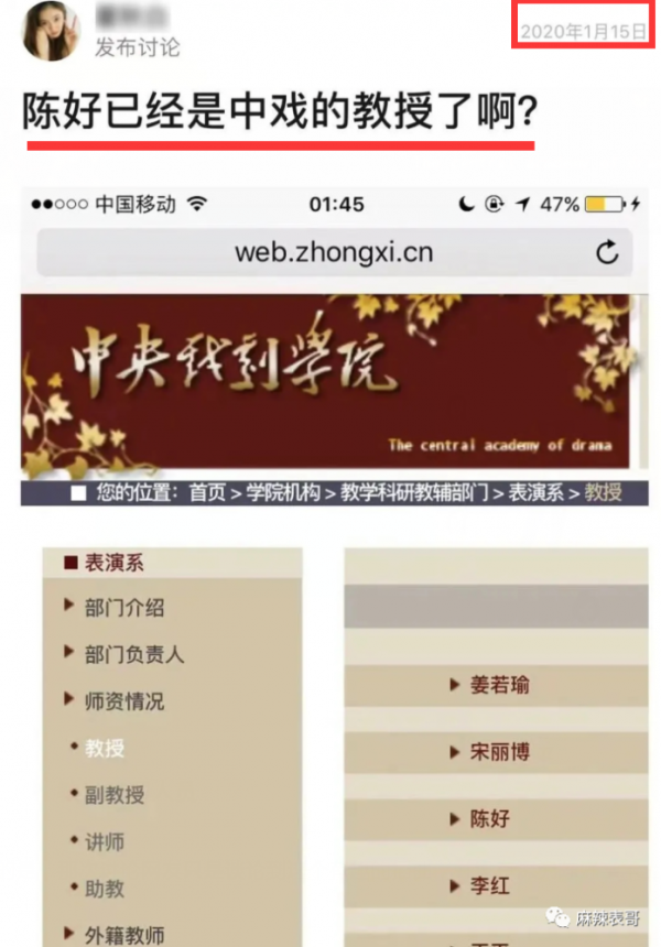 刘天池、蒋雯丽是副教授,周迅属于中戏讲师。我们把时间再往前拉一点,2020年就有人发现了陈好是中戏教授。也就是说她的职称早早的在蒋雯丽、刘天池前面。